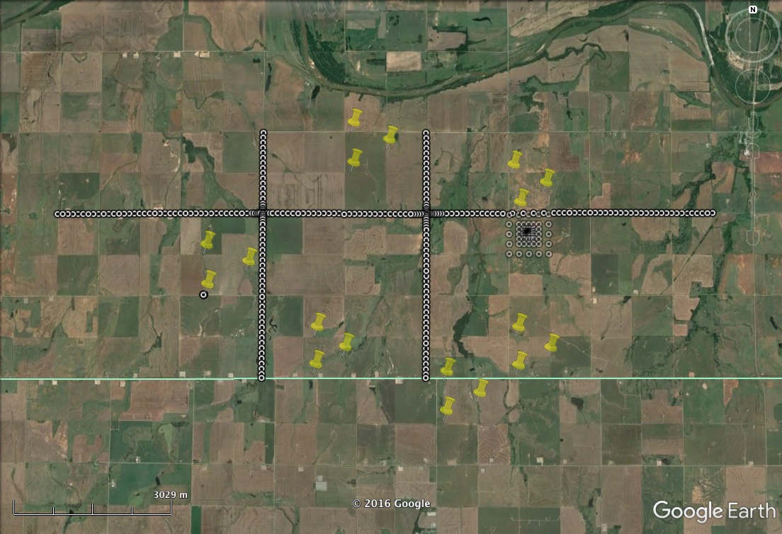 Three seismic lines (composed of 247 nodes) were deployed for 30 days beginning June 20, 2016. Deployed along farm roads, the east-west seismic line spanned 13 km, while the 2 north-south seismic lines spanned 5 km each. Node spacing was 100 m, with increased node density near where the lines intersected.